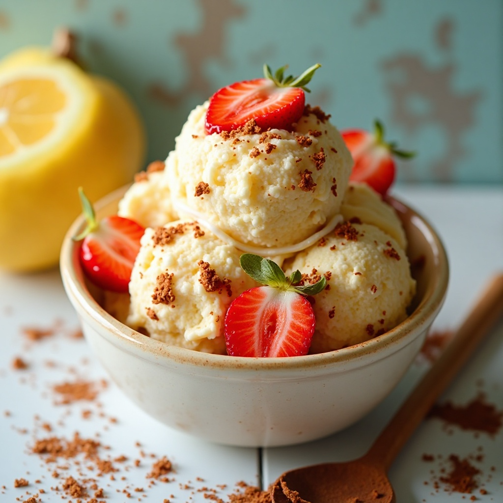 7. Congela el helado hasta que esté sólido y firme. Una vez listo, puedes decorar con fresas y plátano troceados antes de servir, añadiendo un toque de mascar de cacao en polvo para un aspecto más auténtico.