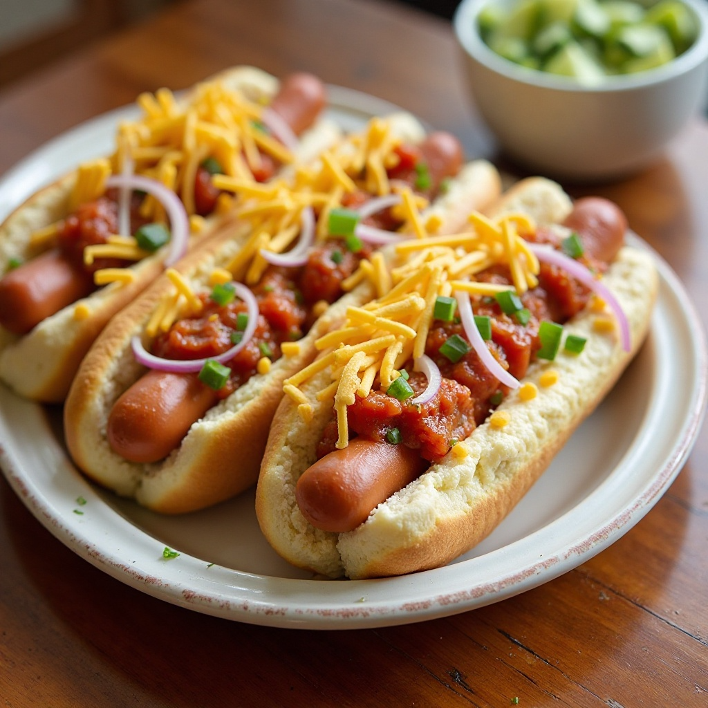 Este plato ofrece una buena fuente de proteínas en los hot dogs y vegetales frescos como toppings. La salsa de tomate casera es una opción saludable para condimentar, ya que evita el uso de condimentos altos en sodio o grasos. Sin embargo, el queso añade un poco de grasa saturada; si se desea una versión baja en grasas, se puede usar menos queso o sustituirlo por un queso bajo en grasa.