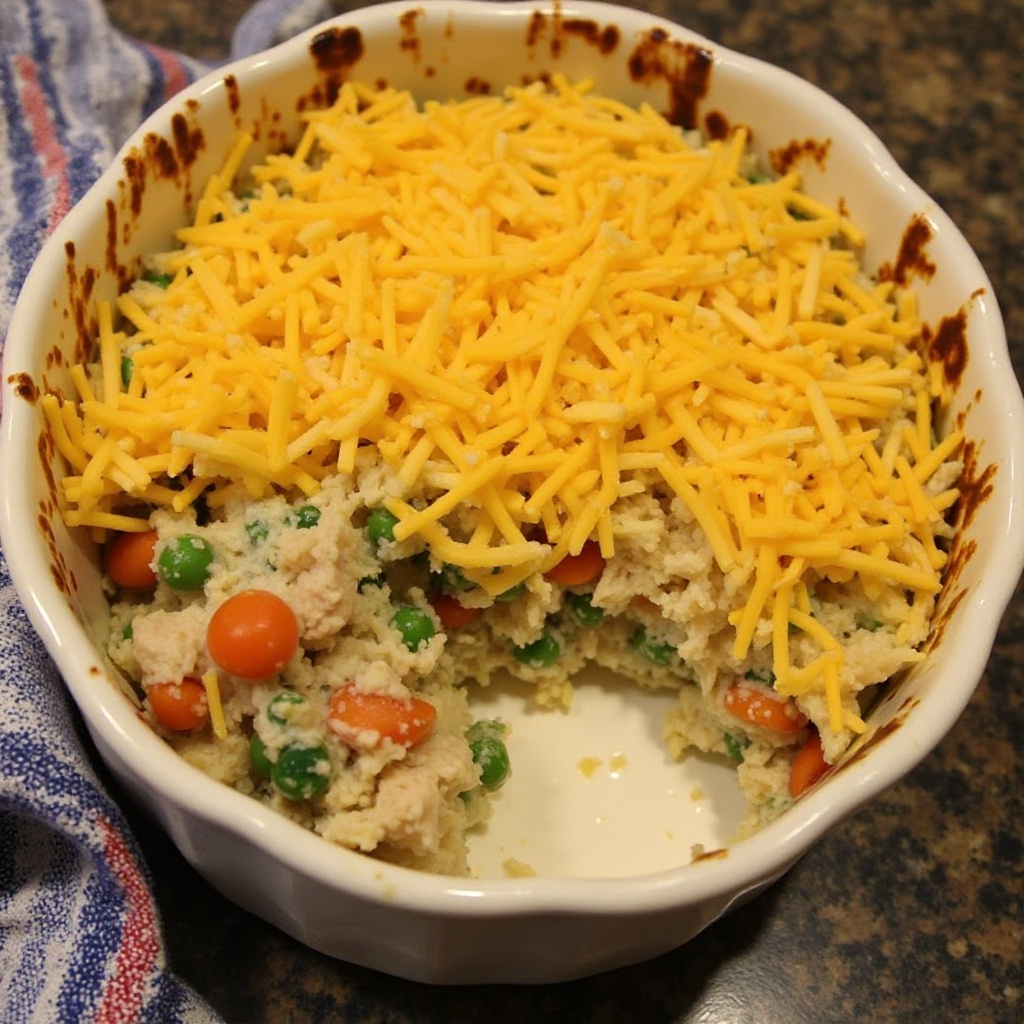 - Coloca la mezcla en un recipiente para horno, extendiéndola uniformemente. Cubre con queso cheddar rallado.