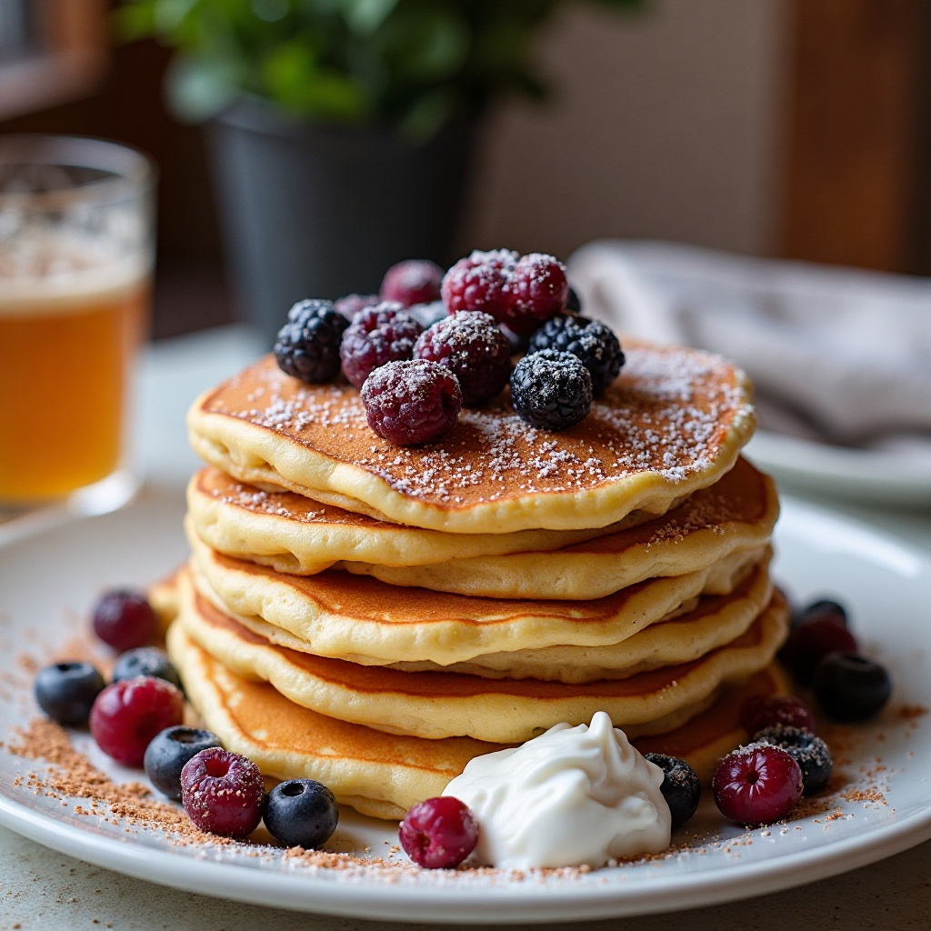 - Una vez listos, sirva los pancakes calientes con crema agria fresca para disfrutar de un desayuno lleno de sabores locales.