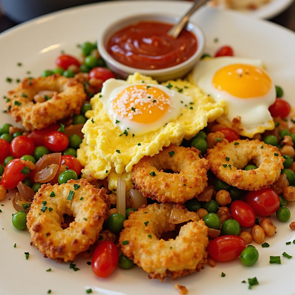 El clásico huevo roto es una comida reconfortante y abundante en muchas partes de los Estados Unidos. En la ciudad de Baltimore, se ha adoptado el uso de chips de camarón (crab cakes) como ingrediente principal para añadir un toque salado y picante a este plato tradicional. Perfecto para aquellos días en que buscas algo fácil de preparar pero lleno de sabor.