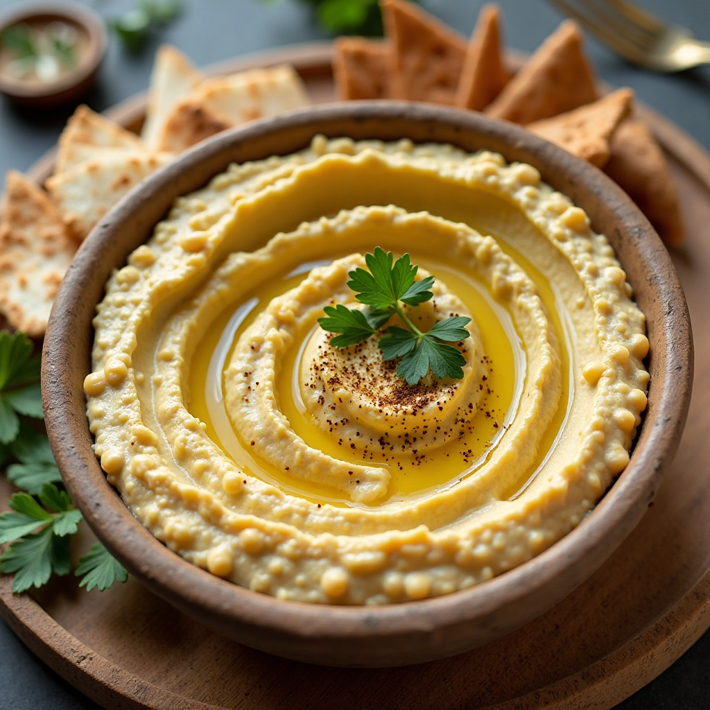 El hummus es un plato emblemático del mezze libanés, un estilo culinario que se caracteriza por una variedad de platos pequeños servidos como aperitivo. Originario de la región levantina, este hummus se destaca por su cremosidad y sabor intenso. Es tradicionalmente servido con pan ácrico o pita para disfrutar de un sabroso aperitivo.