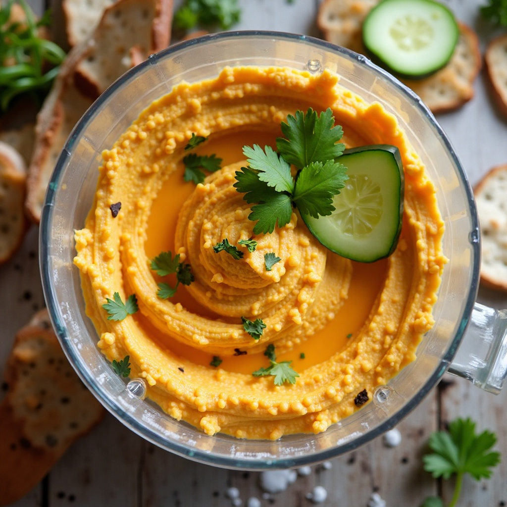 - Transfiere el hummus a un plato o bol y decora con cilantro fresco picado y rodajas de pepino para una presentación más atractiva.