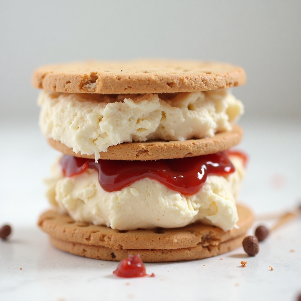 - Coloca la segunda rebanada de galleta encima del helado con mermelada, asegurándote de que ambas galletas estén alineadas y sellen el helado adecuadamente.