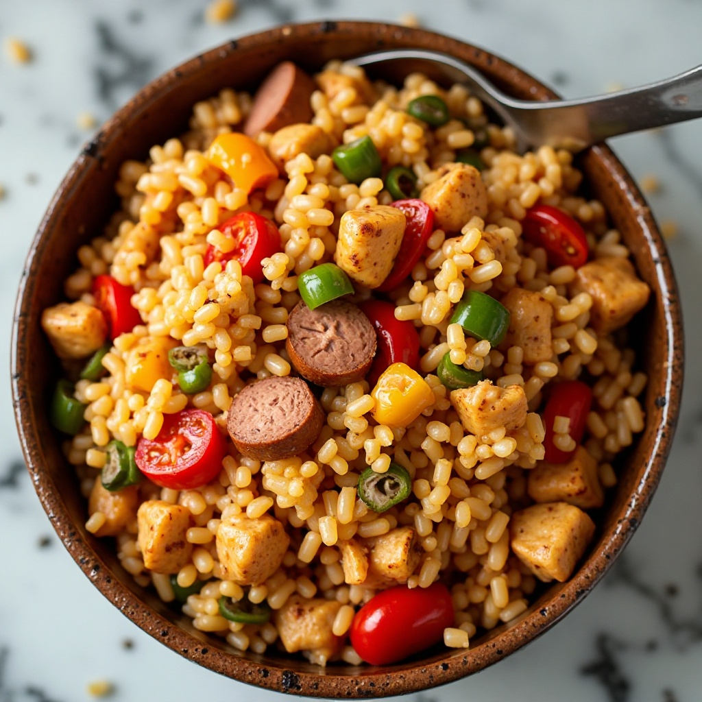 El Jambalaya es un plato bien balanceado nutricionalmente, rico en proteínas a partir del pollo y las salchichas. Los vegetales aportan fibra. Asegúrate de que el pollo esté completamente cocido para eliminar cualquier riesgo de enfermedad transmitida por alimentos. Si prefieres una versión más saludable, puedes reducir el contenido de grasa utilizando menos aceite y optar por salchichas bajas en grasa.