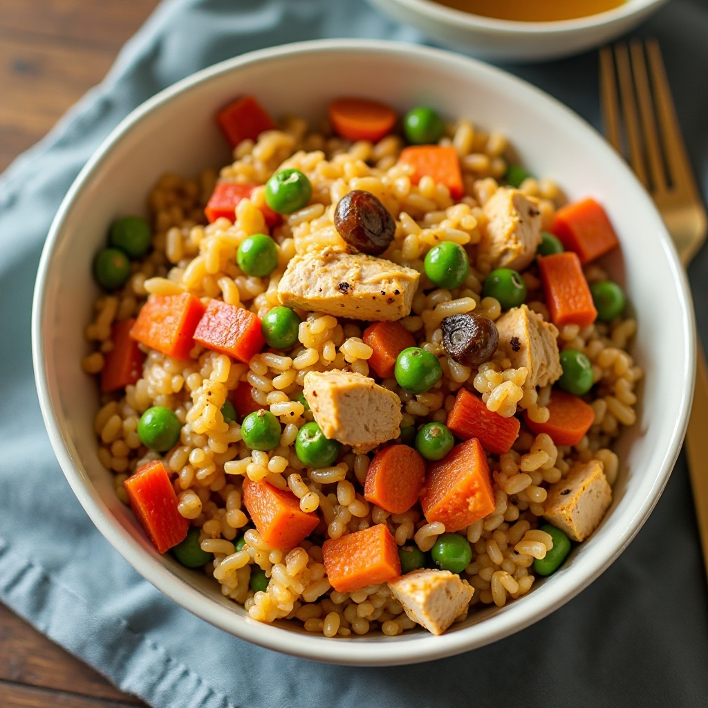 El arroz integral es una opción más saludable que el blanco, ya que contiene fibra y nutrientes adicionales. La selección de pollo y verduras hace que esta versión sea baja en grasas saturadas y rica en proteínas magras. Puedes ajustar la cantidad de condimentos para controlar el nivel de picante o mantener un sabor más suave.