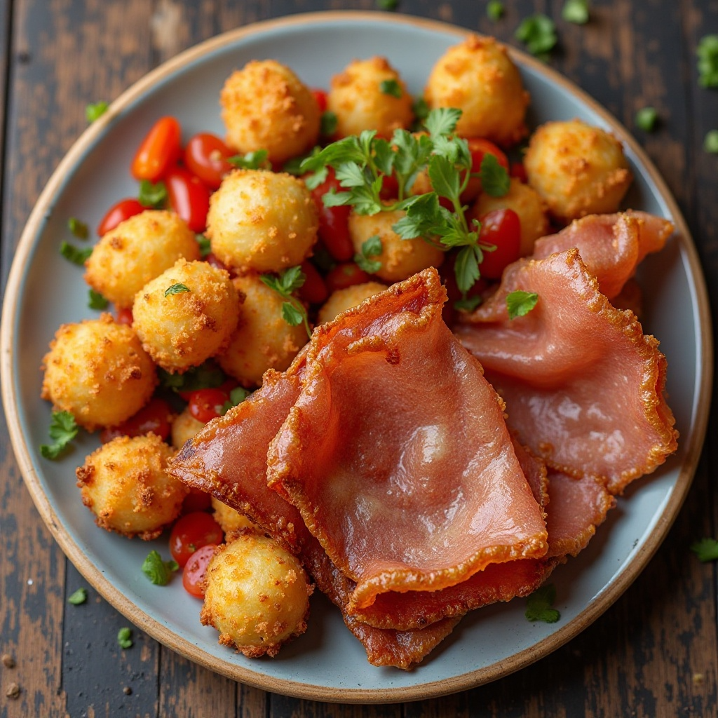 Este plato es una adaptación ideal para un banquete o reunión en España, especialmente disfrutado por los habitantes del municipio de Bubión. Combina la textura crujiente del jamón serrano frito con las patatas bravas y croquetas, creando una explosión de sabores tradicionales españoles.