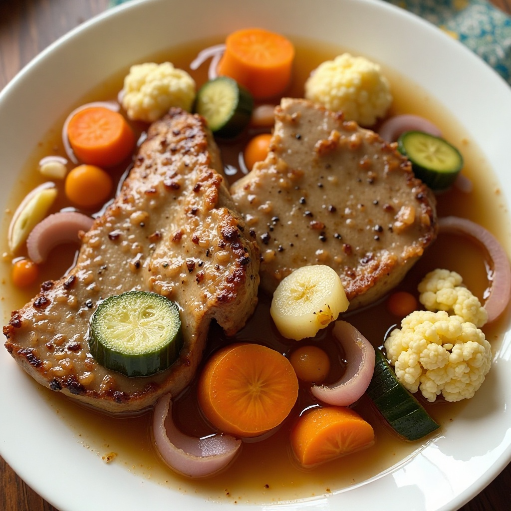 - Retira las chuletas del caldo con una espumadera y coloca en una fuente de servir. Asegúrate de mantener el caldo caliente para mojar las verduras.