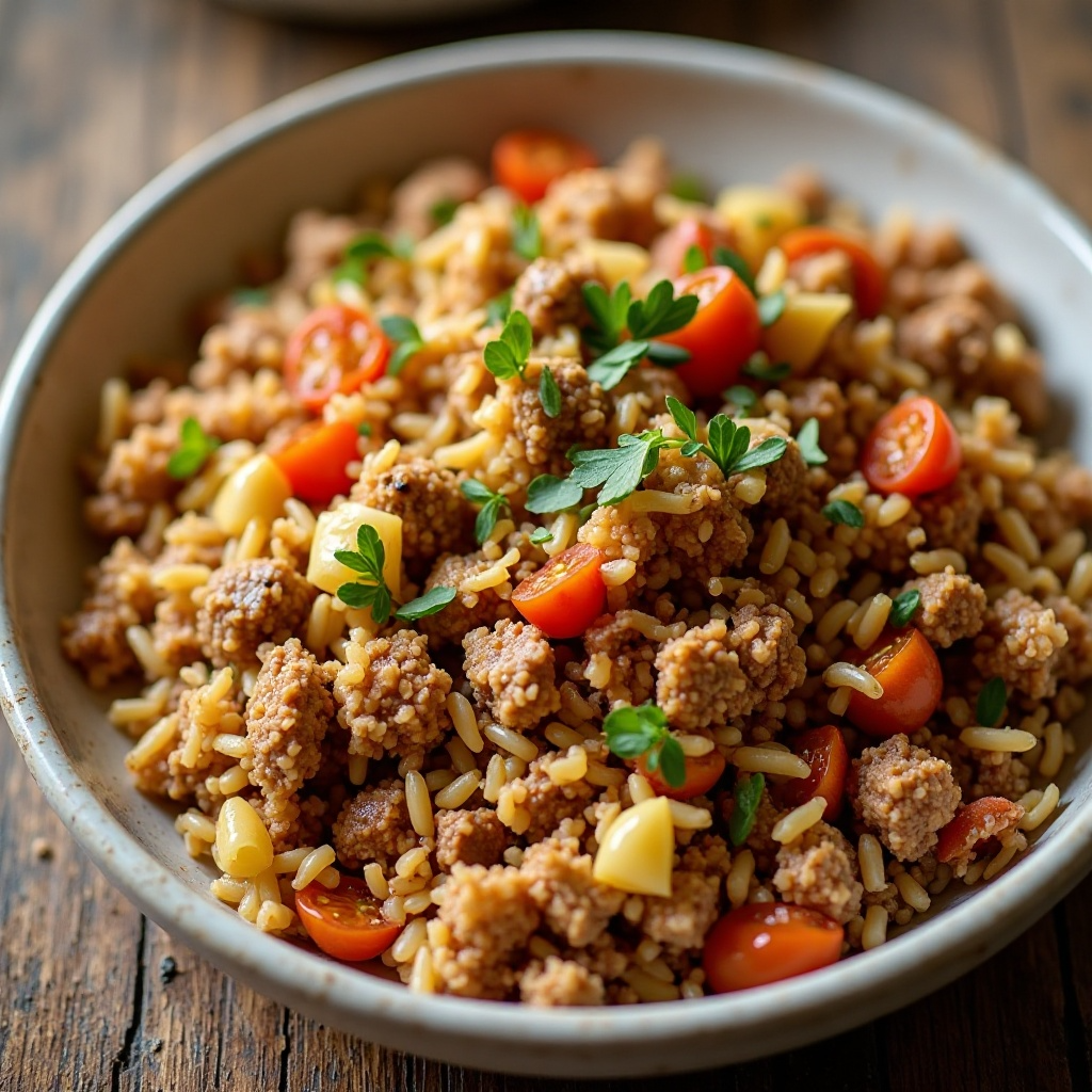 - Una vez que el arroz esté listo, agrega el contenido de la sartén (carne y verduras) al arroz. Revuelve bien para que el arroz se integre con los ingredientes de la carne. Cocina durante unos 5 minutos más, permitiendo que los sabores se mezclen y las especias penetren en el arroz.