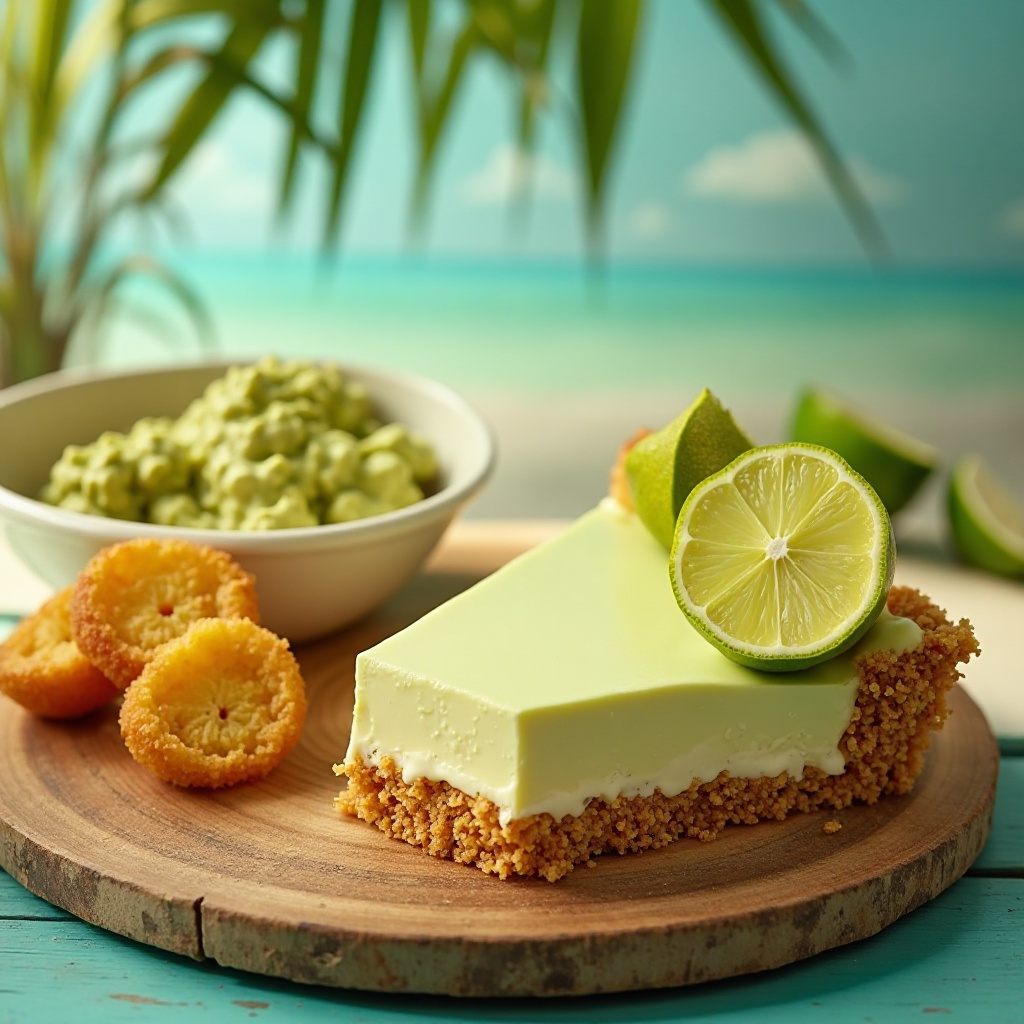 La isla Key, parte de los Estados Unidos conocidos como Florida Keys, es famosa por su cocina tropical que combina elementos de la cultura caribeña con ingredientes locales. Este plato, inspirado en el clásico Key Lime Pie, añade tostones y guacamole para una experiencia gastronómica auténtica y ligera. Perfecto para disfrutar de un día soleado bajo el cielo azul del sur de Florida.