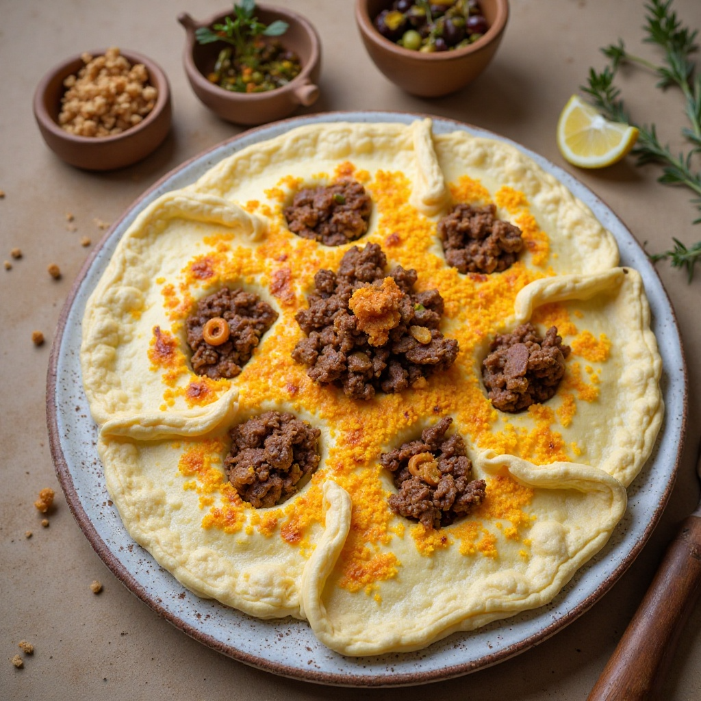 - Coloca cada disco de kiffa en una bandeja para horno forrada con papel encerado. En el centro de cada kiffa coloca una porción de mechoui marinado, asegurándote de que la carne se extienda uniformemente.