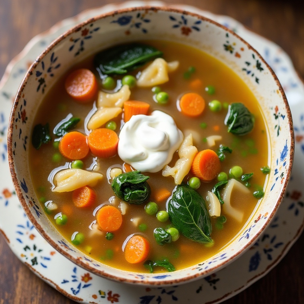 La sopa Knephla es baja en calorías y rica en vegetales, proporcionando vitaminas A y C, y fibra. La opción de añadir guisantes verdes aumenta el contenido de fibra y las espinacas aportan minerales esenciales. Sirve esta sopa como una opción ligera o acompáñala con un pan integral para aumentar su valor nutricional.