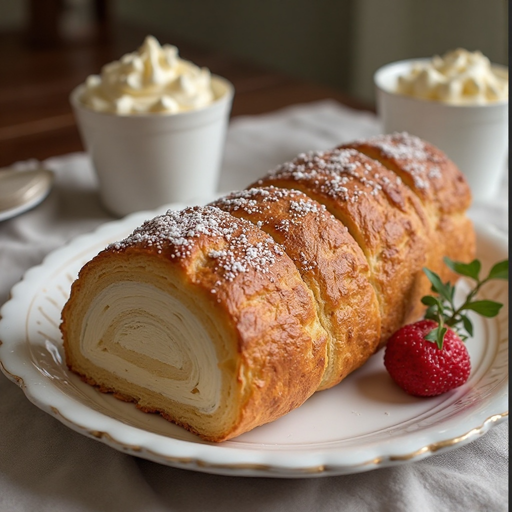 - Enrolla la masa en una forma de cono, similar a un rollo, asegurando que los lados estén bien cerrados. Cubre la masa enrollada con azúcar glas y canela (si lo deseas) para decorar.
