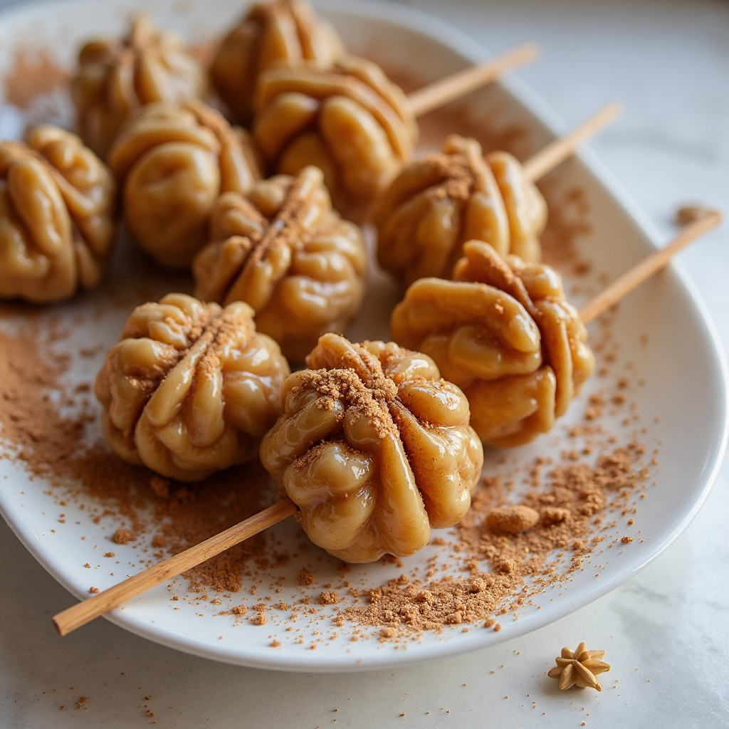 - Retira las nueces de la mezcla y colócalas en un soporte o palito limpio, asegurándolas bien para que se mantengan en posición vertical. Esto puede hacerse en forma de espiral o al gusto personal.