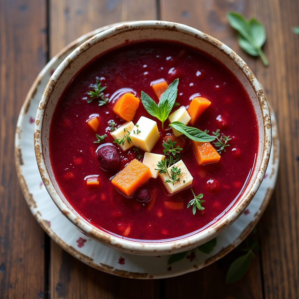 Esta versión de borscht es rica en antioxidantes gracias a la remolacha y las zanahorias, mientras que el kvass proporciona vitaminas B y probióticos naturales, lo que promueve una digestión saludable. El queso Saratov añade un toque cremoso, pero se recomienda moderación para aquellos que controlan su ingesta de calorías.
