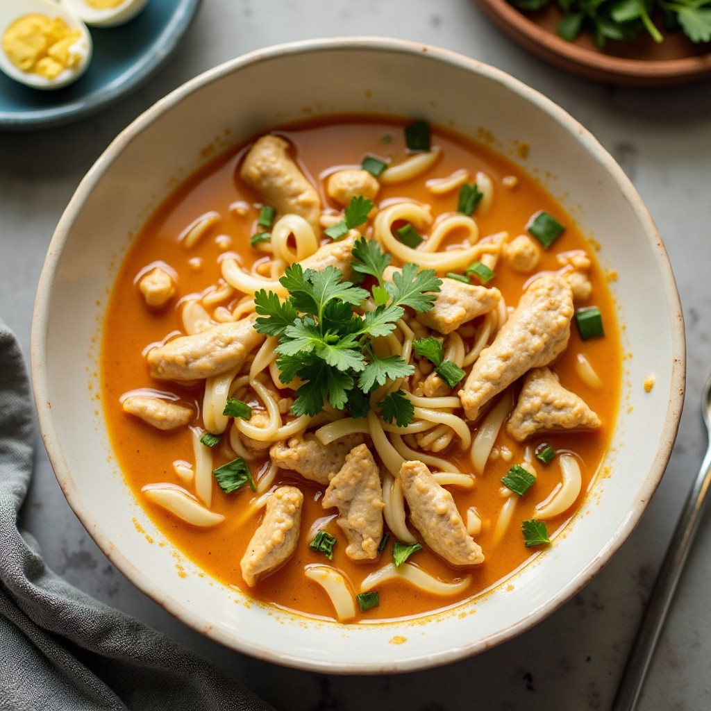 El laksa es un plato emblemático de Singapur, reflejando su rica mezcla cultural y gastronómica. Aunque tradicionalmente está hecho con mariscos, esta versión de pollo es una adaptación que permite a un público más amplio disfrutar del sabor característico de Singapur sin las preocupaciones de picantes. Es una muestra de cómo la cocina evoluciona para satisfacer las preferencias individuales y las restricciones dietéticas.
