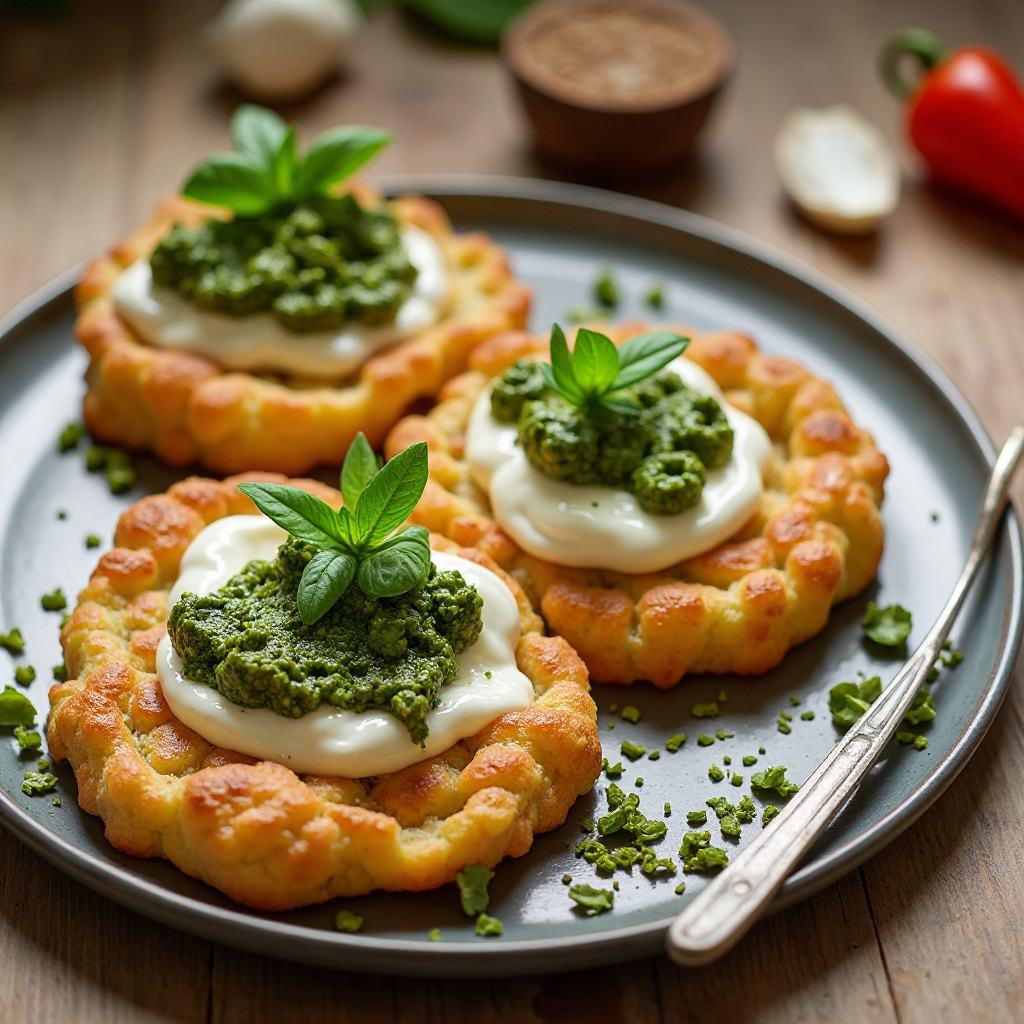 5. Una vez fritos, quita los langos de la sartén y colócalos sobre una fuente para servir. Espolvorea el pesto fresco sobre cada pieza de langos.