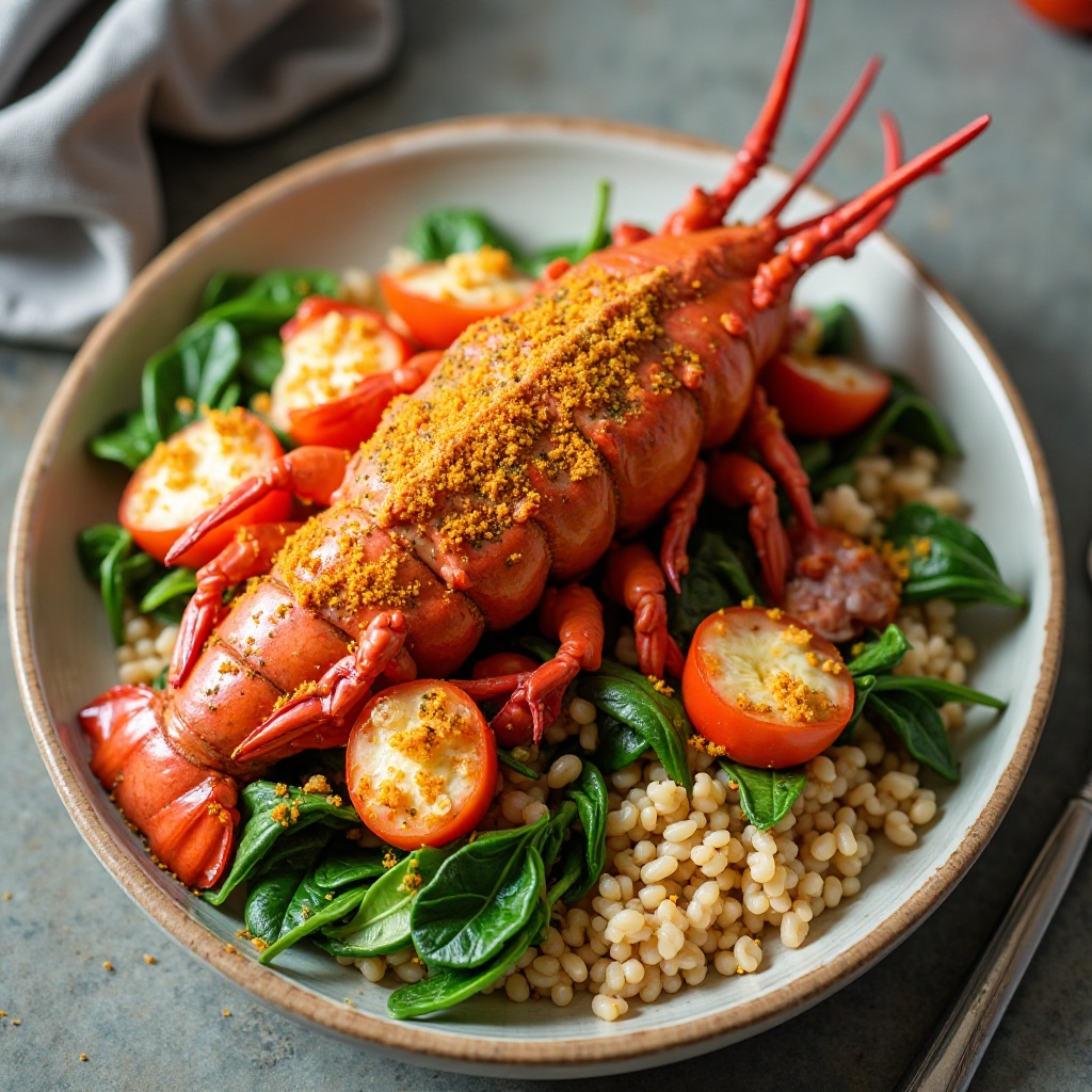 Este plato es una fuente excelente de proteínas y fibra gracias al arroz integral y las espinacas. La langosta proporciona ácidos grasos omega-3, conocidos por su contribución a la salud cardiovascular. Además, las espinacas son ricas en vitamina K, vitamina A, y calcio, lo que convierte este plato en una opción nutricionalmente balanceada.