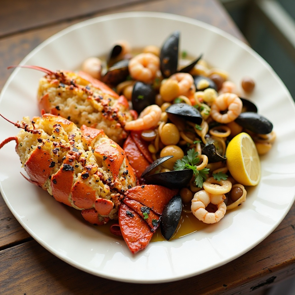 La langosta es rica en proteínas y ácidos grasos omega-3, beneficiosos para la salud cardiovascular. La ensalada de mariscos aporta una variedad de nutrientes esenciales. Asegúrate de cocinar los mariscos adecuadamente para eliminar cualquier riesgo de contaminación por bacterias. Si tienes alergias a frutos del mar, ten cuidado al preparar y servir esta receta.