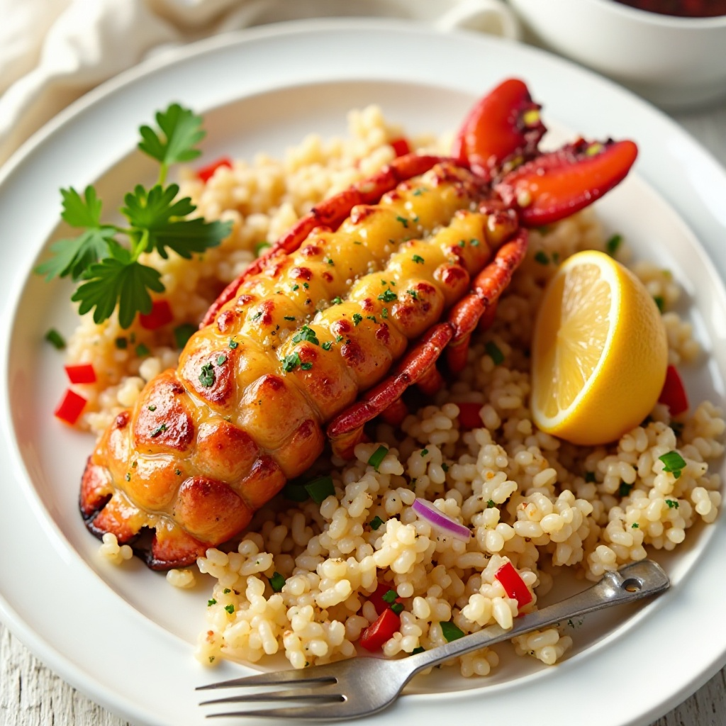 La langosta del Caribe es un marisco muy apreciado en las islas y costas del Caribe. A menudo se prepara de diversas maneras, pero el método a la parrilla o al horno, como aquí, es una opción popular que realza su sabor natural. El arroz pilaf también tiene raíces en muchas culturas caribeñas, siendo una forma versátil de cocinar el arroz que se adapta a diversos ingredientes locales.