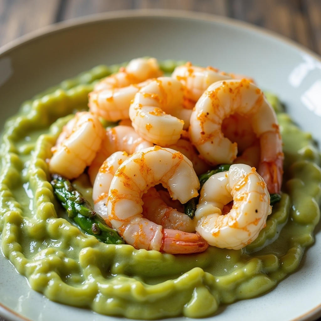 - Sirve el puré de espárragos por plato. Coloca un langostino sobre cada porción. Rocía con un poco de salsa de nata sobre los langostinos y sirve inmediatamente, disfrutando de la frescura del marisco en Tynemouth.
