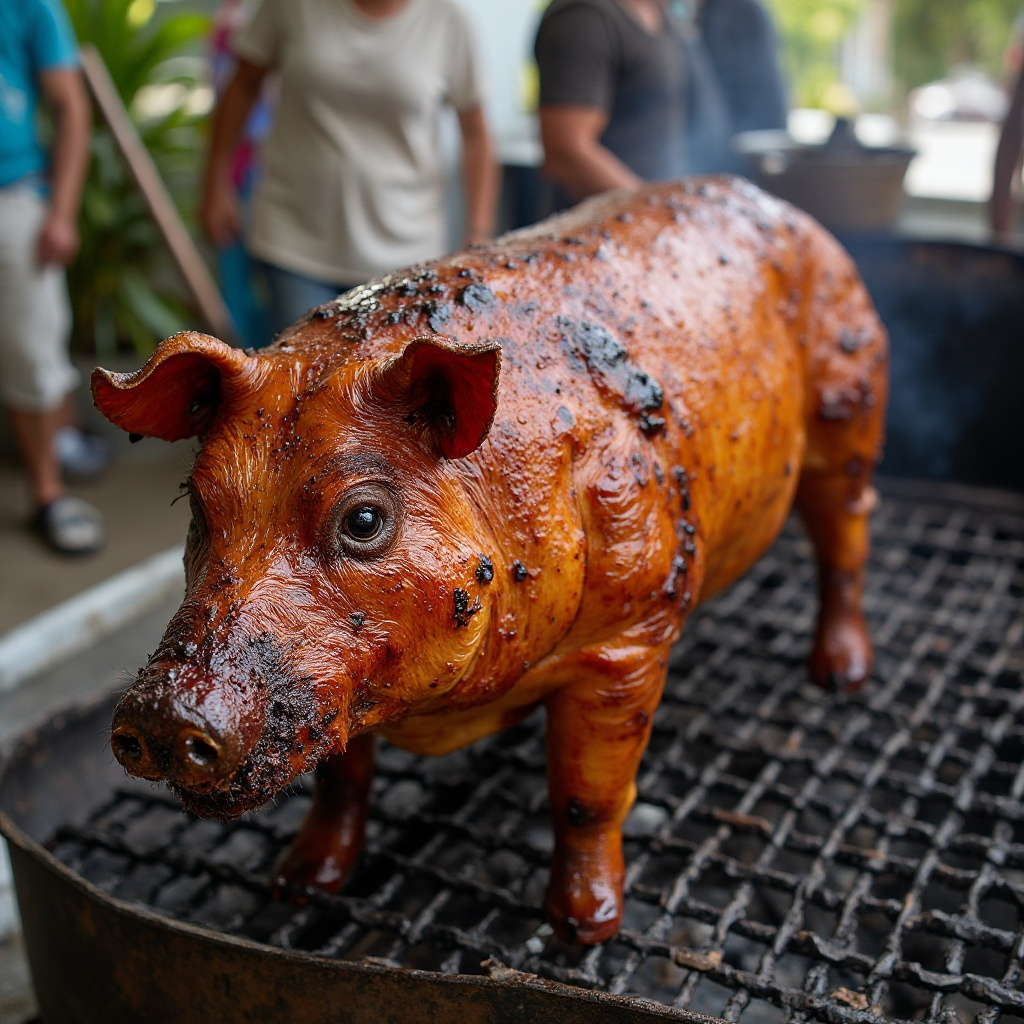 - Prepara un asador con carbón o madera (preferiblemente piña o guayaba para darle un toque regional). Coloca el lechón sobre el fuego y cocina a fuego medio-bajo, cubriendo el lechón con una tapa de barbacoa para mantener la humedad.