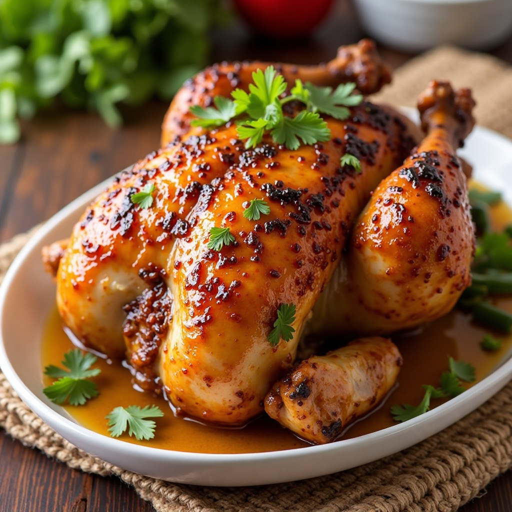 - Saca el pollo del horno y déjalo reposar durante unos 10 minutos antes de cortarlo. Sirve con hojas de cilantro fresco, si lo deseas.