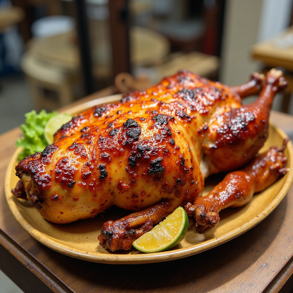- Precalienta el horno a 180°C (350°F). Cocina el pollo a temperatura media durante aproximadamente 1 hora y media, hasta que la piel esté crujiente y dorada.