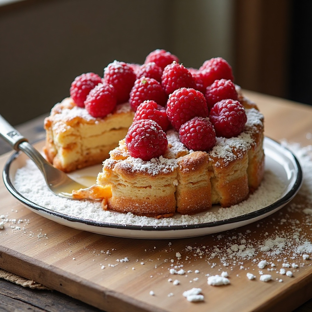 6. Decora el pastel con frambuesas enteras, alternando capas si se desea, y pincela con huevo batido para un aspecto dorado.