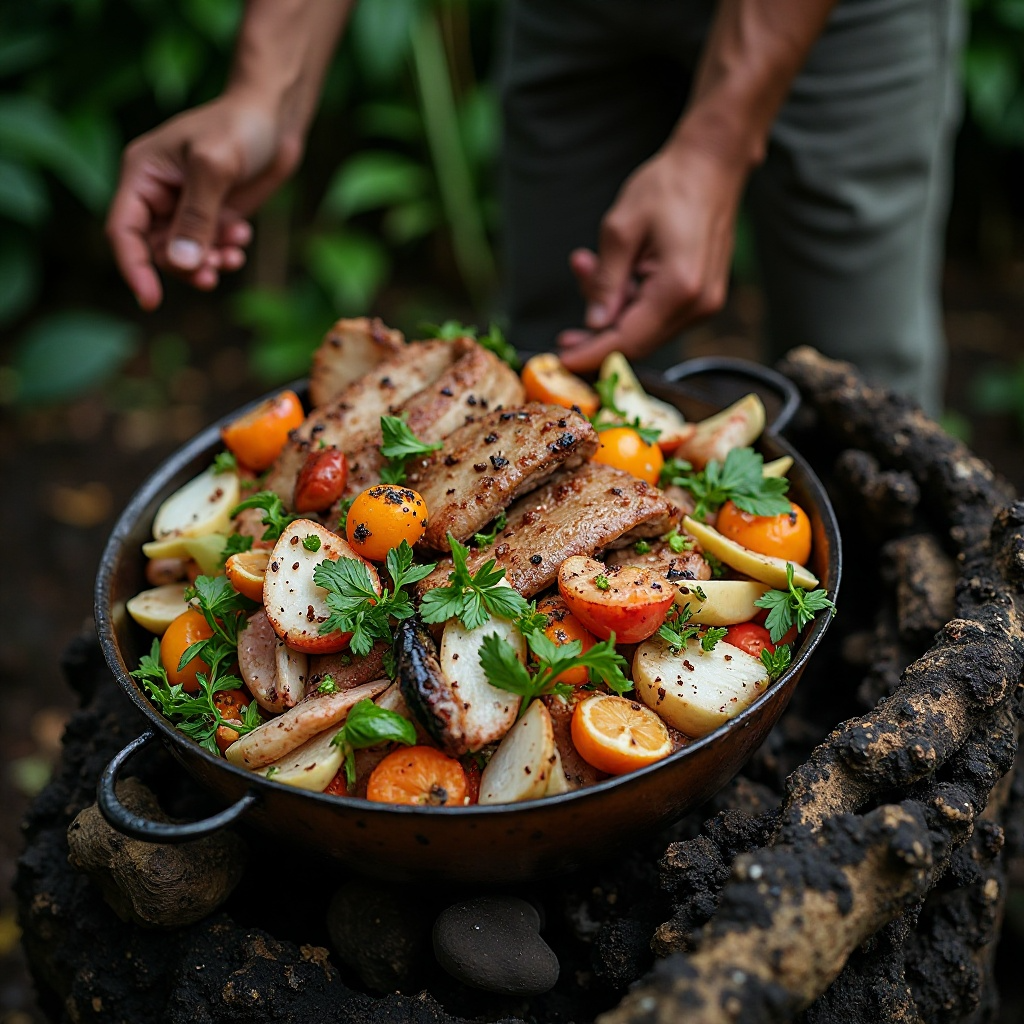 8. Una vez cocidos, retira la tapa con cuidado y sirve el Plato de la Isla directamente del lovo. Acompaña con arroz o patatas para equilibrar los sabores.