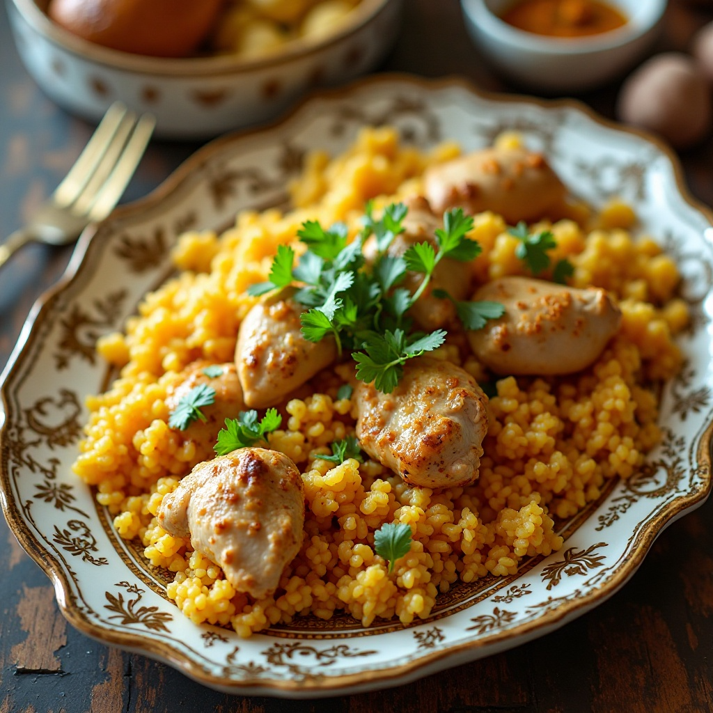 Machboos es un plato tradicional del Golfo Pérsico, especialmente popular en países como Kuwait. Esta versión especial está preparada para Abdullah Al-Salem, con pollo como ingrediente principal, ofreciendo una experiencia culinaria auténtica que combina sabores intensos y especias tradicionales.