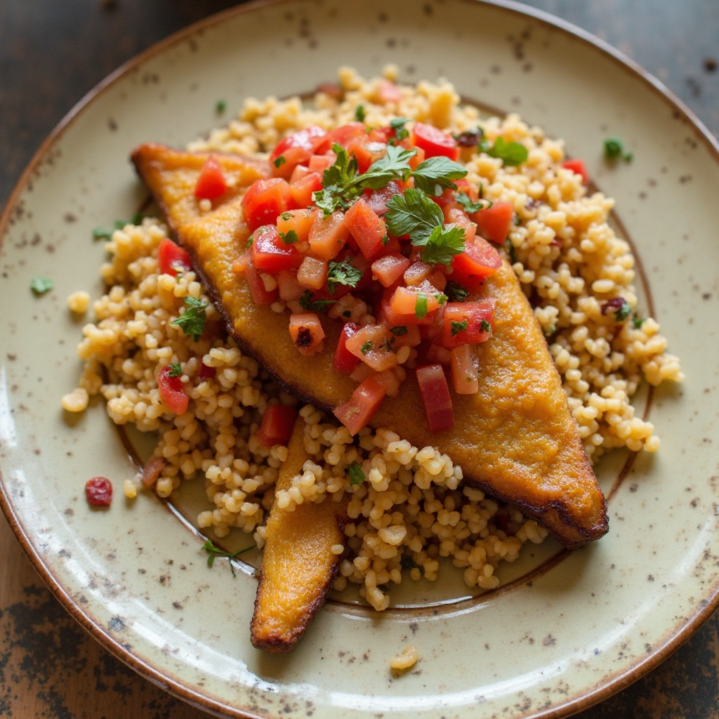 El plato Maka Mboke y Soso es una representación vibrante de la cocina local en Kisangani, República Democrática del Congo. Inspirado en los sabores intensos de la región, este plato combina la textura crujiente del plátano frito con la frescura del pescado, adornado con especias locales que le dan un toque único.