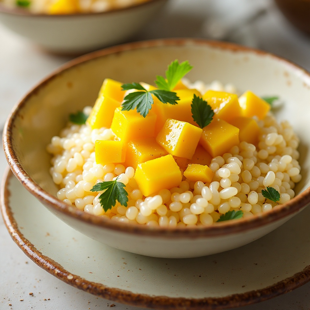 - Sirve el arroz caliente en platos individuales, colócate los cubos de mango sobre el arroz y decora con hojas de cilantro si lo deseas.