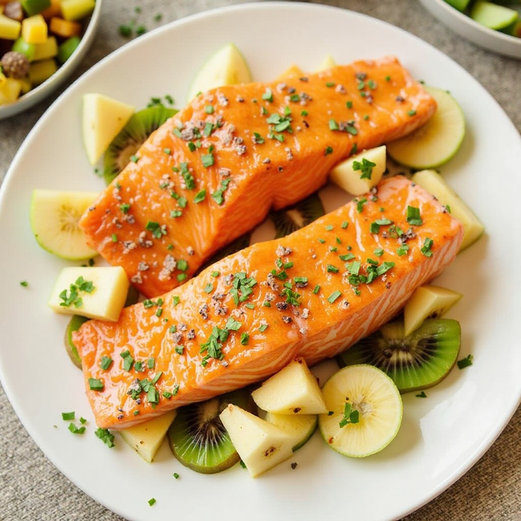 6. Sirve el salmon junto a la ensalada de frutas tropicales, disfrutando del contraste de sabores dulces y salados.