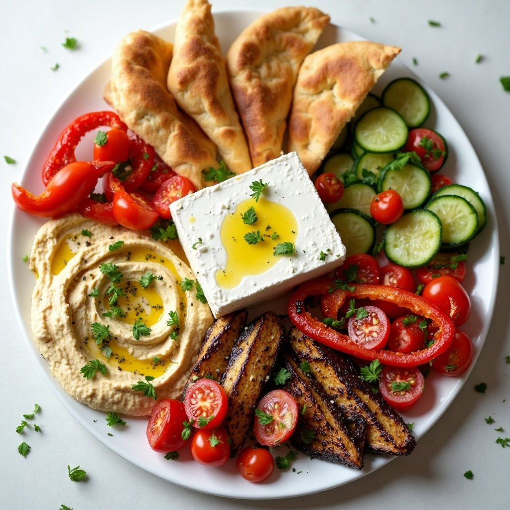 - Finalmente, presenta todos los mezze juntos, sirviendo cada uno por separado. Sirve los tomates y pepino, los pimientos asados, y la berenjena en un plato grande. Coloca el queso feta al centro para que cada bocado tenga un toque salado.