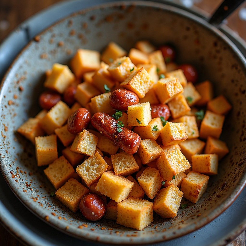 - Vuelve a añadir los chorizos dorados al sartén, junto con un poco de aceite si fuera necesario. Sigue removiendo las migas y los chorizos hasta que las migas adquieran una textura crujiente y sepan a pan tostado, aproximadamente 10-15 minutos más.