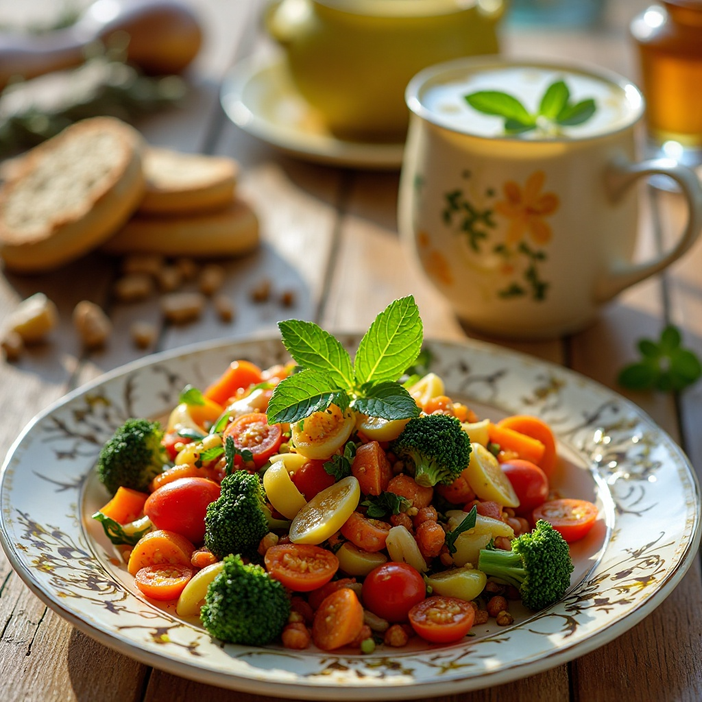 El té de menta es conocido por sus propiedades calmantes y antioxidantes. El salteado de verduras aporta vitaminas, fibra y antioxidantes, siendo una opción saludable para cualquier comida. Si prefieres una versión más ligera, reduce la cantidad de aceite de oliva o usa aceite de oliva extra virgen.