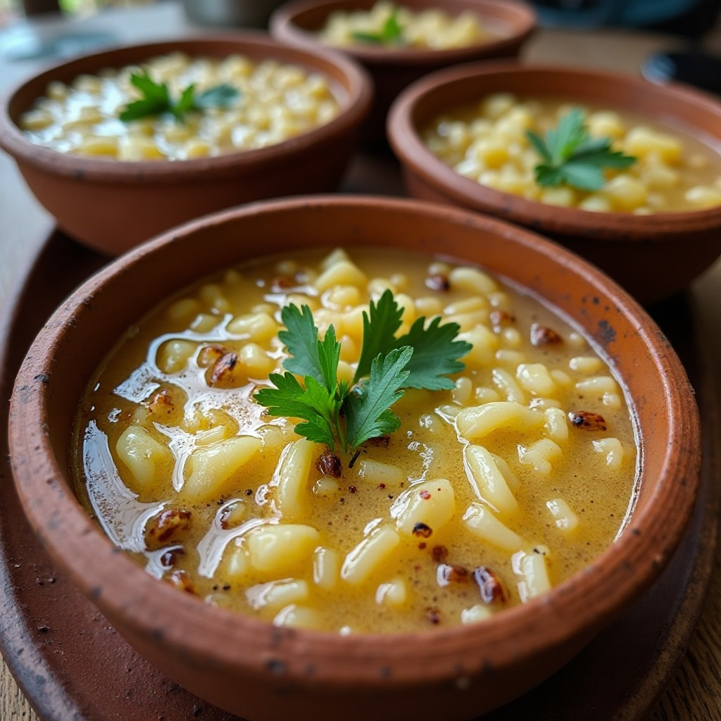 5. Una vez listo el caldo, agrega el arroz cocido con una cuchara, asegurándote de que no se pegue. Sirve el Mohinga caliente en platos pequeños, decorándolo con perejil picado.