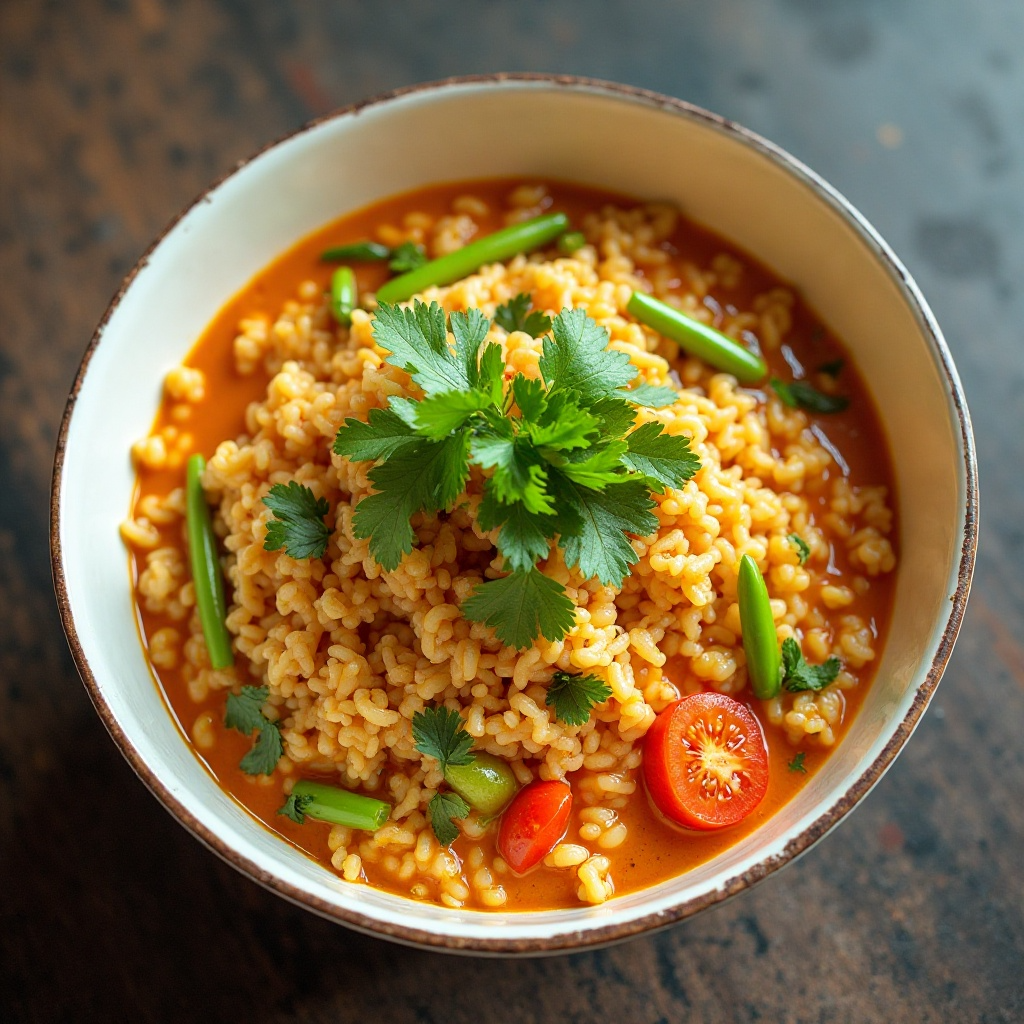 - Antes de servir, reintroduce el arroz con curry en la sartén caliente durante unos minutos para calentar todo bien. Agrega las hojas de cilantro, frijoles verdes (si lo deseas) y tomates cherry. Sazona al gusto con más sal si es necesario.