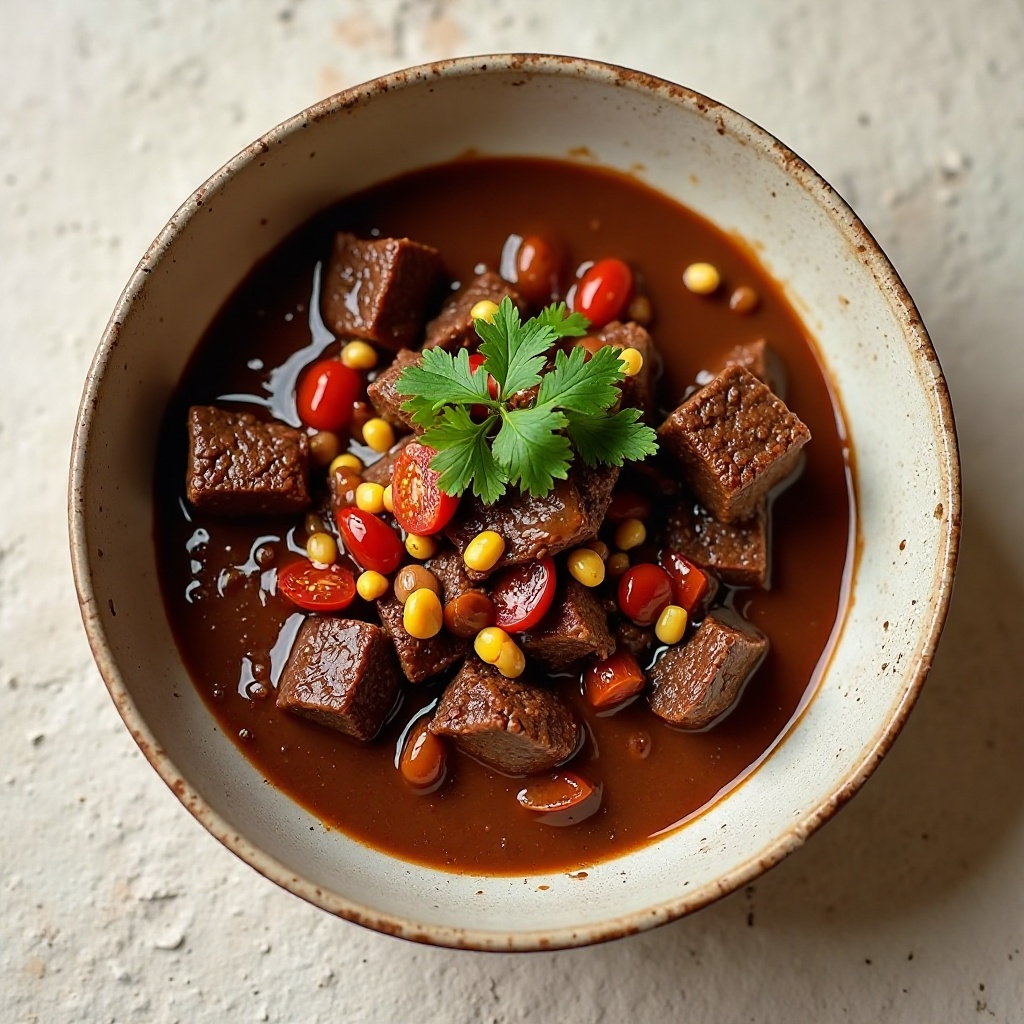 - Vuelve a añadir la carne de res a la olla y mezcla bien para asegurar que todos los sabores se fusionen. Sirve caliente, disfrutando de la compleja combinación de sabores que evoca tradiciones precolombinas.