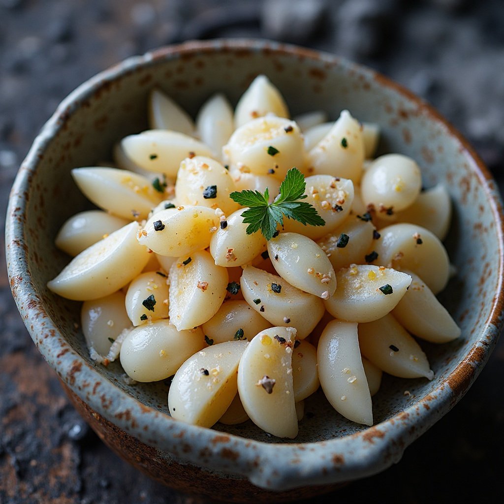 - Sirve el muktuk marinado frío o caliente, según tu preferencia. Para una versión más elaborada, puedes añadir cebolla en juliana fina y alcachofa cruda picada para un contraste de sabores y texturas.