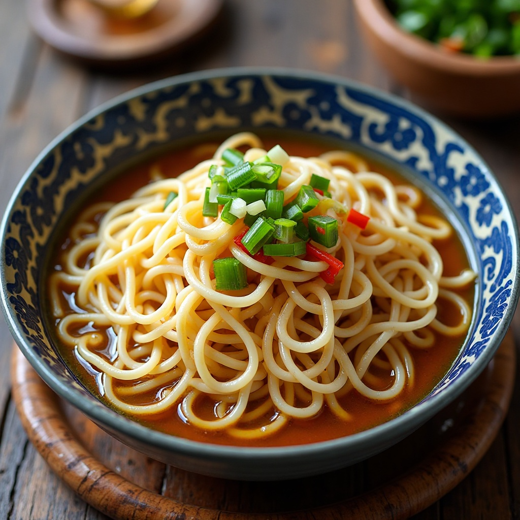 4. Sirve inmediatamente en tazones individuales, asegurándote de que cada porción esté llena de fideos y caldo. Sirve además cebolla roja y pimientos en rodajas como acompañamiento si lo deseas.