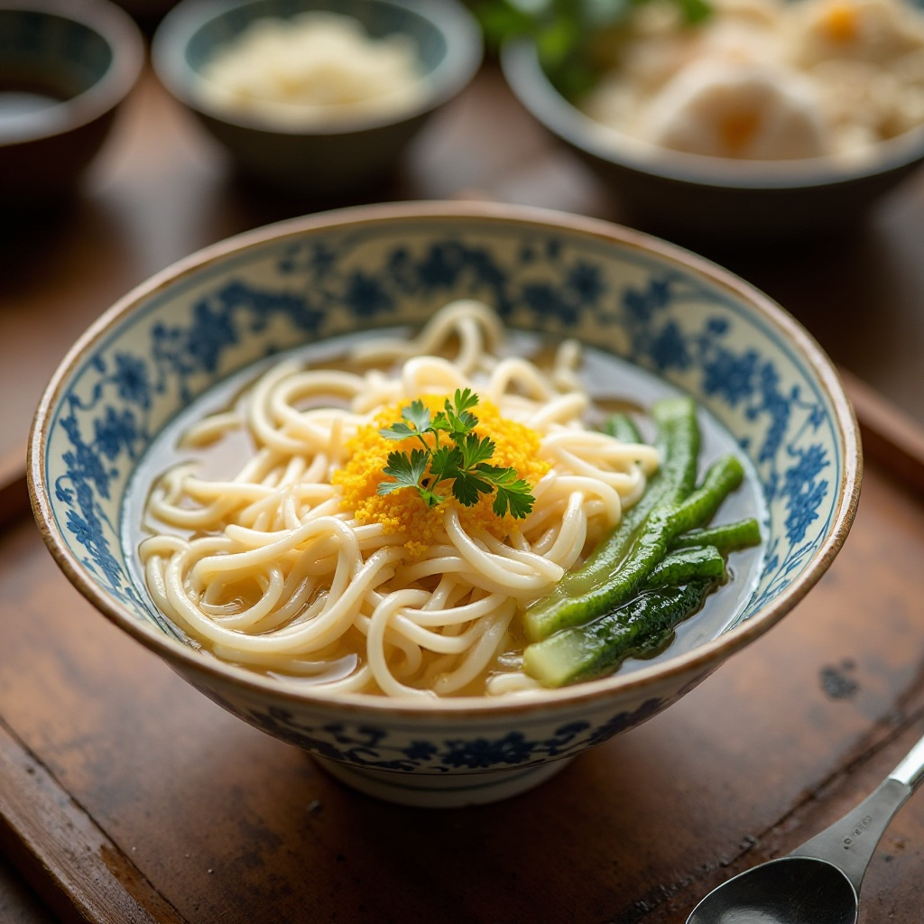 Naengmyeon es una sopa fría tradicional surcoreana, conocida por su frescura y su textura única de fideos finos y ligeros. Aunque la receta original es popular en las provincias del norte de Corea del Sur, en esta versión adaptada se pretende respetar los ingredientes típicos pero ajustar al contexto de Chongjin, una ciudad conocida por su cocina de raíces coreanas. Este plato ofrece un deleite refrescante en cualquier época del año.