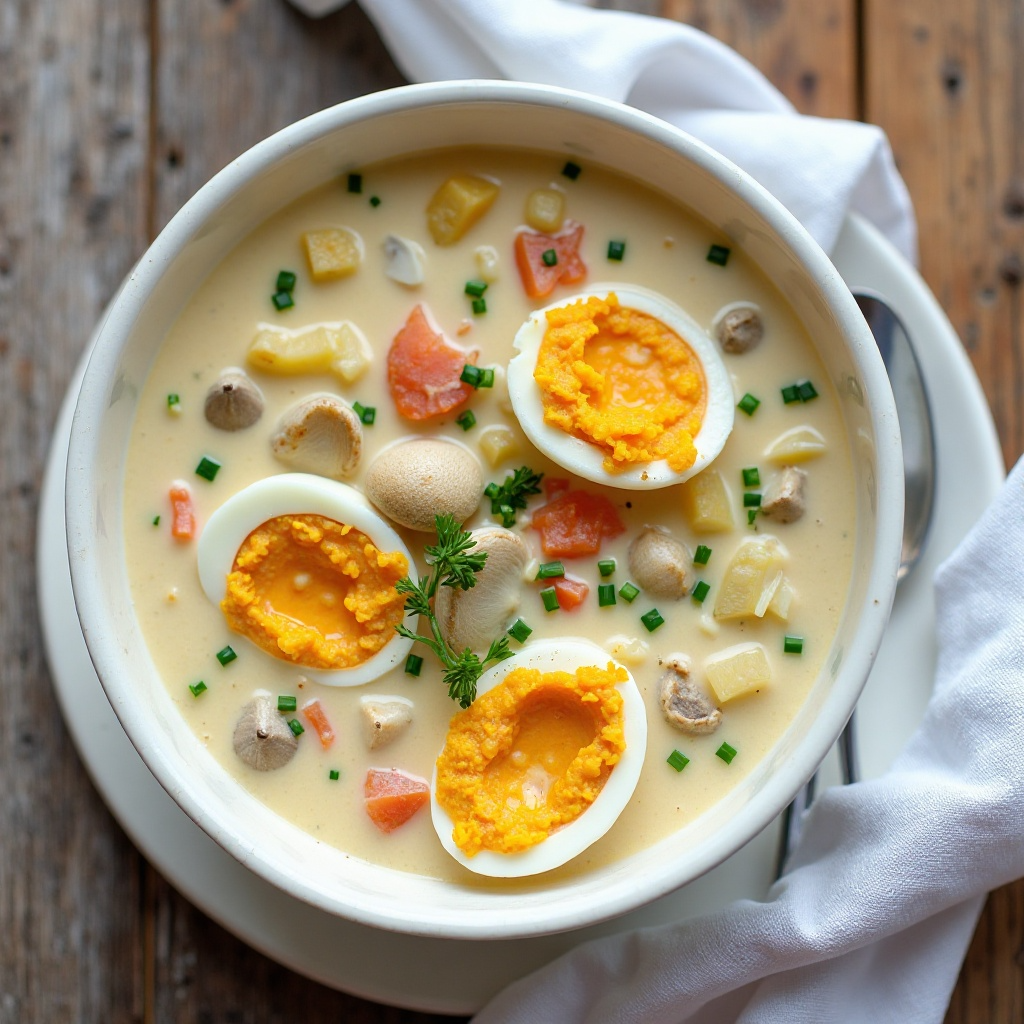 - Agrega sal y pimienta al gusto, y luego revuelve para incorporar los mejillones cocidos. Sirve caliente con huevo duro y cebollino en la parte superior, si se desea.