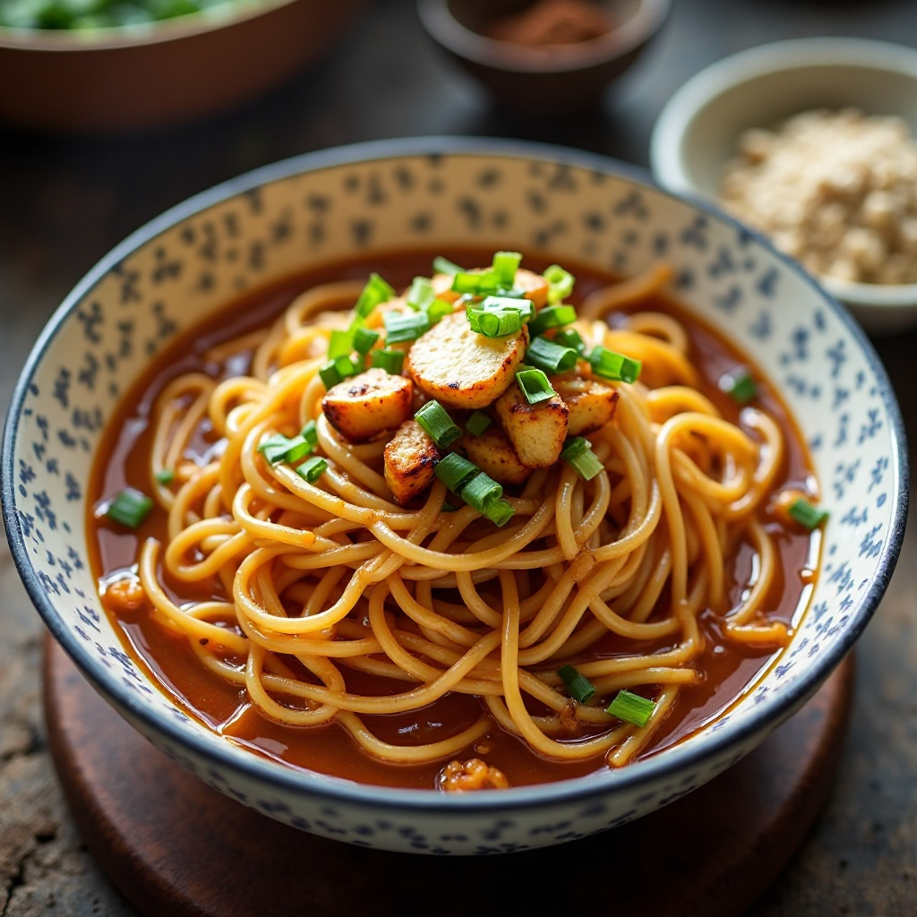 El plato Zha jiang mian es una expresión culinaria típica de la región de Beijing, China. Su creación se remonta a los mercados callejeros locales, donde se vendía en puestos móviles conocidos como «dian xi fang». Este platillo es emblemático de la gastronomía china, destacando por su combinación de sabores fuertes y la técnica de «frying tofu», que requiere práctica para lograr la textura perfecta.