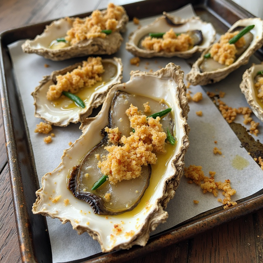 - Coloca la bandeja de ostras en un horno precalentado a 180°C (350°F) durante 5 minutos, hasta que las ostras estén rosadas y el ajo esté ligeramente tostado.