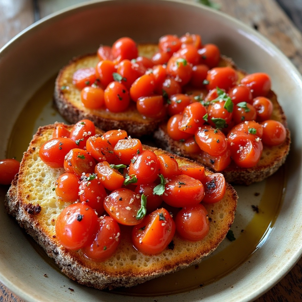 - Una vez listo el pan, retíralo de la sartén y sírvelo inmediatamente. Reparte las porciones de tomate cocido sobre cada rebanada de pan y riega con un poco de aceite de oliva si lo deseas.