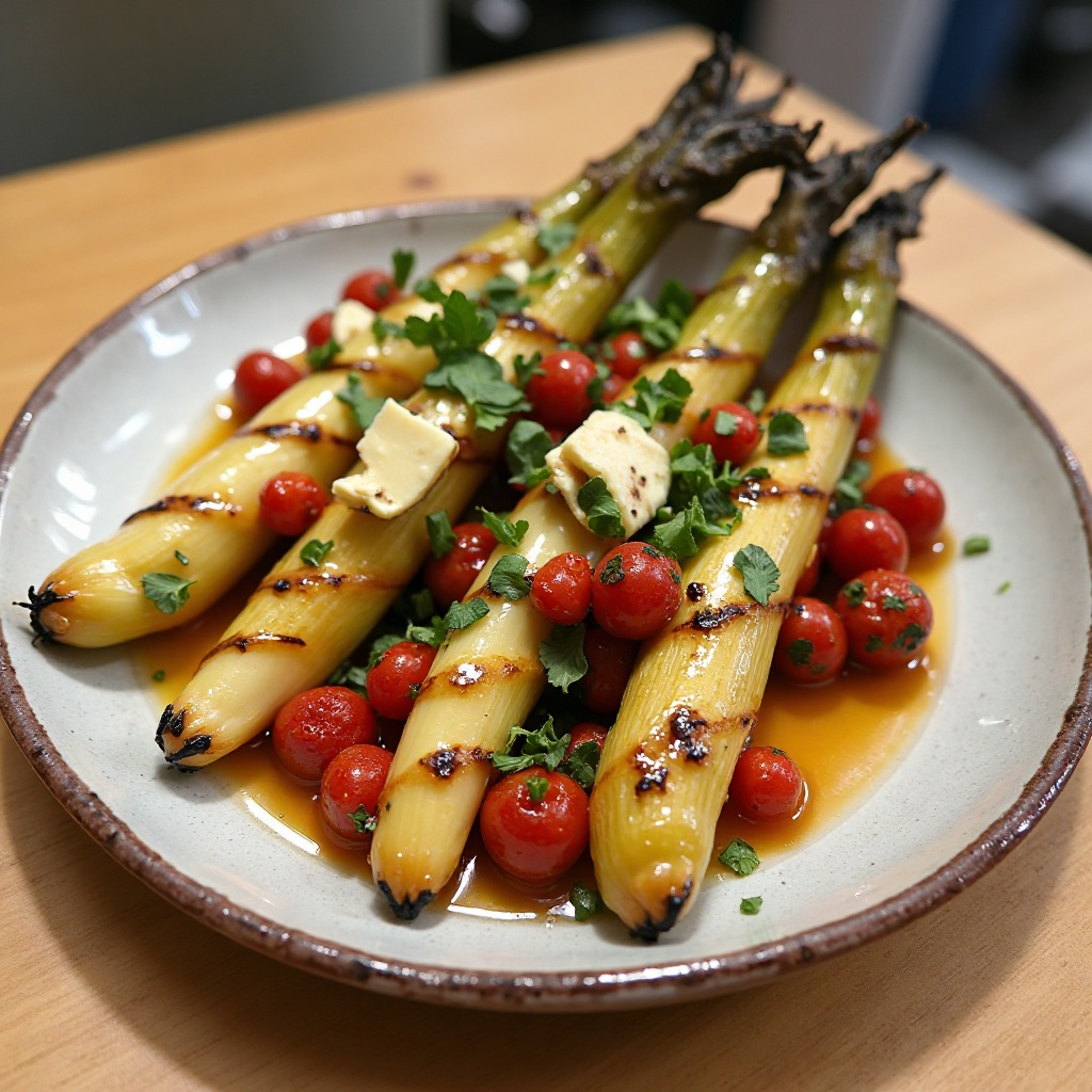 2. En una parrilla, asa los calçots a fuego medio hasta que estén tiernos y ligeramente carbonizados. Retíralos del fuego y deja enfriar para poder pelarlos fácilmente.