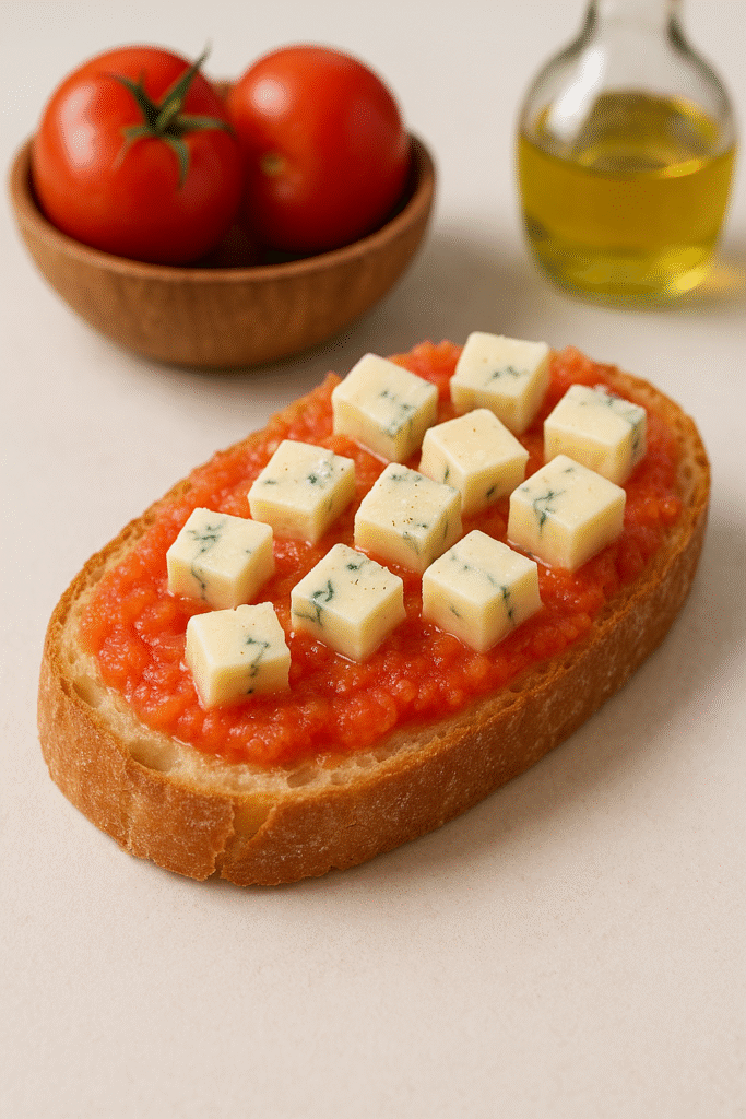 El queso Mahón es un queso azul originario de la isla de Menorca, famoso por su sabor picante y textura cremosa. En Ciutadella, la capital de la isla, se prepara un tradicional pan con tomate (pa amb tomàquet) que complementa perfectamente este queso. Esta receta es ideal para disfrutar de un aperitivo gourmet o como parte de una comida mediterránea.