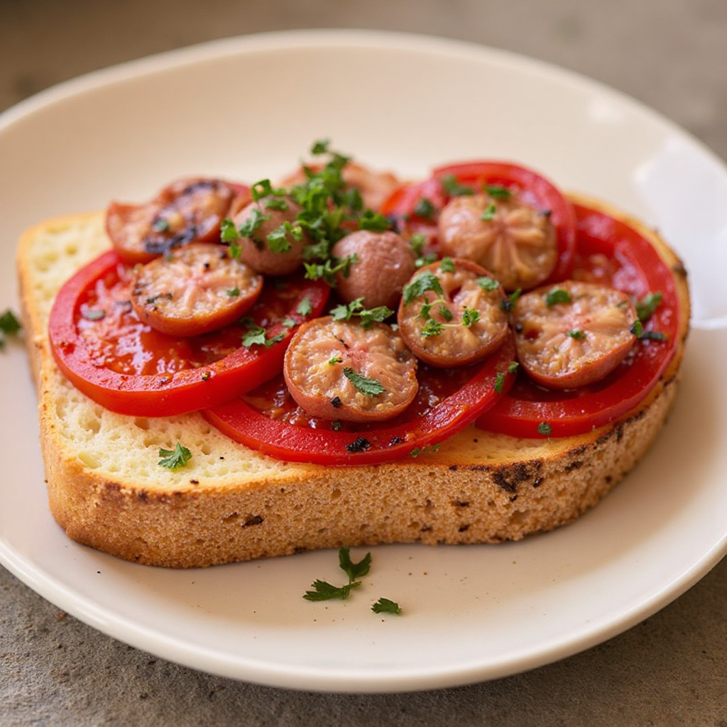 Este plato es una opción saludable gracias a los tomates, ricos en licopeno, un antioxidante, y el pan, que proporciona energía. La salchicha artesanal añade sabor pero debe consumirse con moderación debido a su contenido en grasas y sal. Una alternativa podría ser utilizar salchicha de pollo o vegetariana si se busca una versión más ligera.